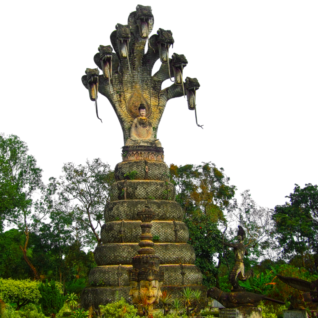 In Hinduism and Buddhism, Nagas are serpentlike deities or semidivine beings. They are often depicted with human upper bodies and snake tails, residing in underground realms or bodies of water. Nagas are associated with fertility, protection of the Buddha and Dharma (teachings), and the control of weather phenomena like rain. In Buddhist tradition, Nagas are revered as guardians of treasures and wisdom, while in Hindu mythology, they play multifaceted roles as both benevolent protectors and agents of cosmic balance.